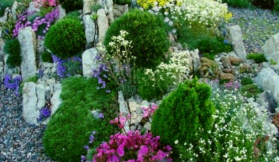 Stony gardens, mountain rocky gardens, rocky hills, rocky ridges, rock or alpine gardens, are special kinds of flower beds, original approaches of garden design, like sophisticated plant complexes of trees, shrubs, flowering plants, grasses, mosses and lichens, allowing to simulate mountainous landscape. Rocky garden should look like in a natural way. Therefore, it should be surrounded by a wide space, such as a lawn. It should be located away from the object of regular geometric shapes, such as, for example, flat beds and flower beds, straight paths and geometrically regular water. Such a stone garden, due to its arbitrary shape will not be in harmony with them. Although, if the rock garden includes a pond edged with stones, it will look attractive. The art of creating rocky gardens is forming a unified and harmonious art complex from a living (plants) and inorganic (stones, pieces of rocks, slabs, water) nature.