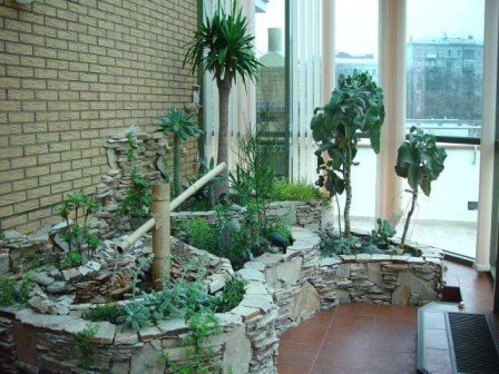 In conservatories, much of the territory is allotted to green spaces. Plants which are used for the formation of the winter garden can be either natural or artificial ones.