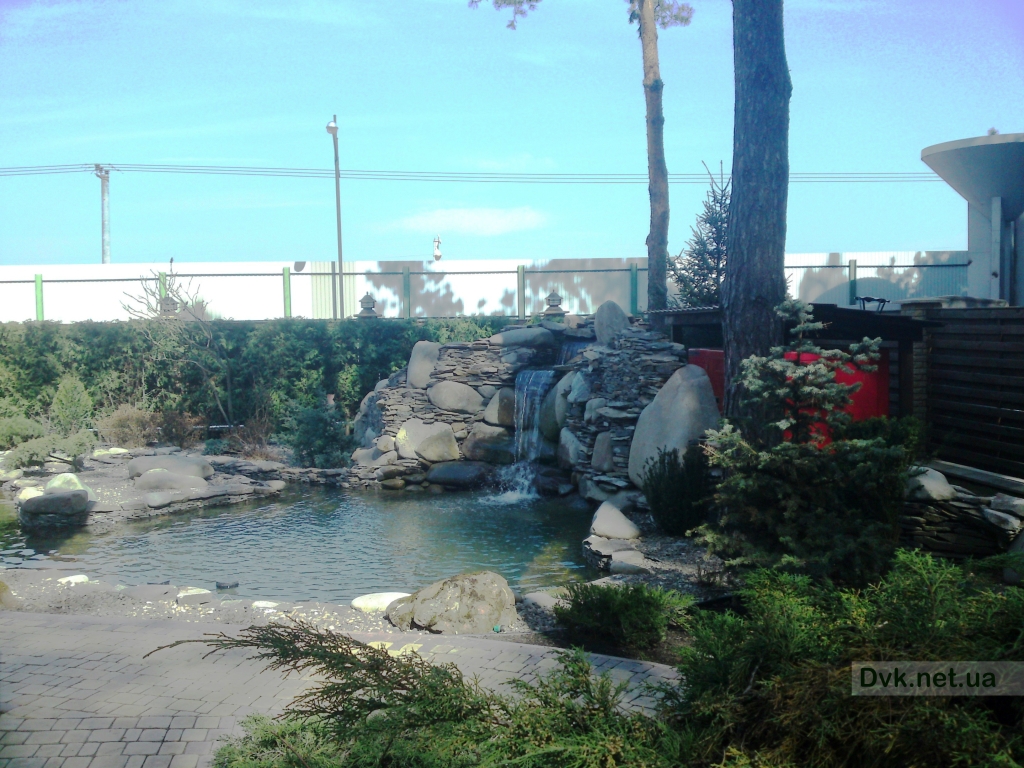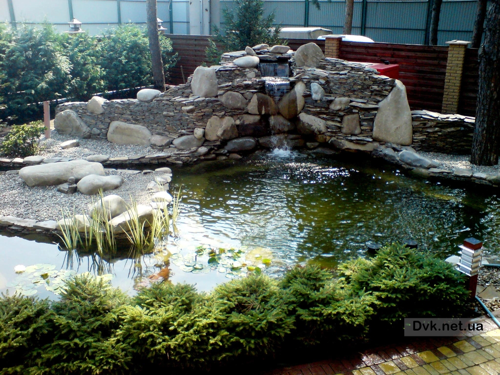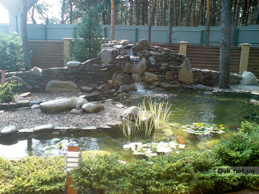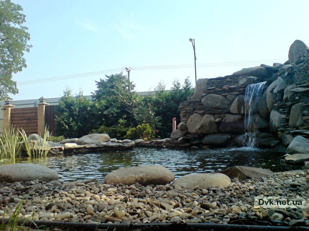На приватній ділянці виконувалось будівництво озера для зариблення 30 м2 площею, з острівком для зелених насаджень та 2х метровим водоспадом.З обладнання були підібрані та встановлені насосні, фільтрувальні та аераційні системи. Для створення необхідної мікрофлори для карпів Кої були висаджені водяні лілії, очерет, оксигенатори та водорості.