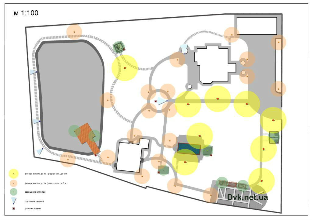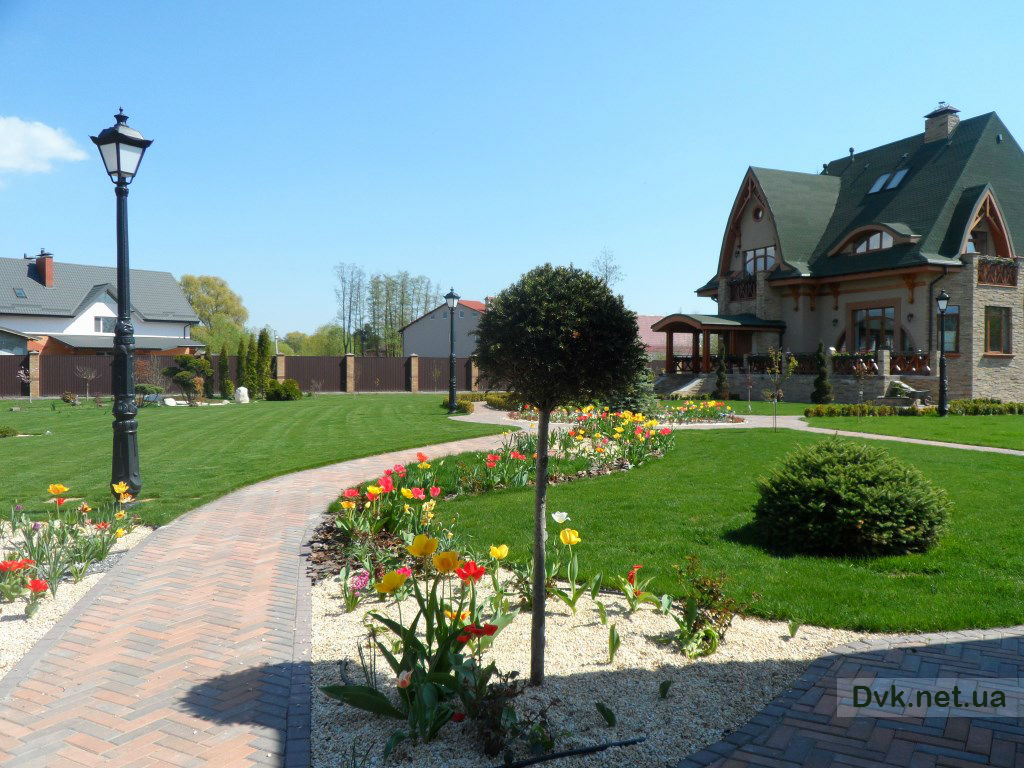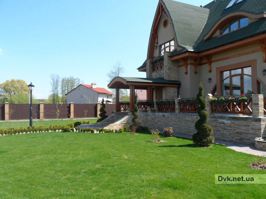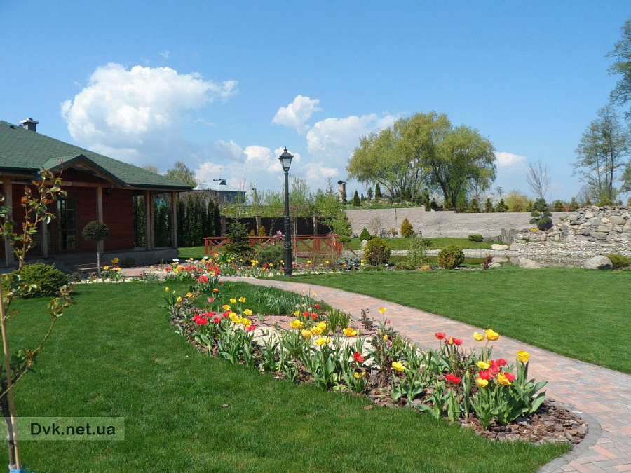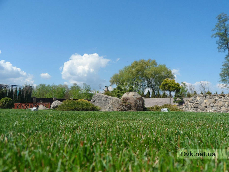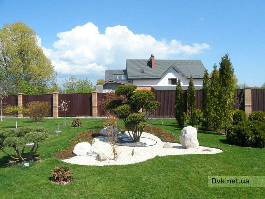 Цей сонячний маєток спеціалісти студії ландшафтного дизайну створили повністю за 2 робочих сезона, починаючи від облагородження водойми площею 1300 кв.м. з будівництвом водоспаду висотою 4 метри, та закінчуючи посадкою усієї декоративної рослинності.Головною задачею проектування було зберегти широкий простір ділянки у 80 соток и, не загроможджуючи його великими деревами, залишити якомога більше сонячної території.