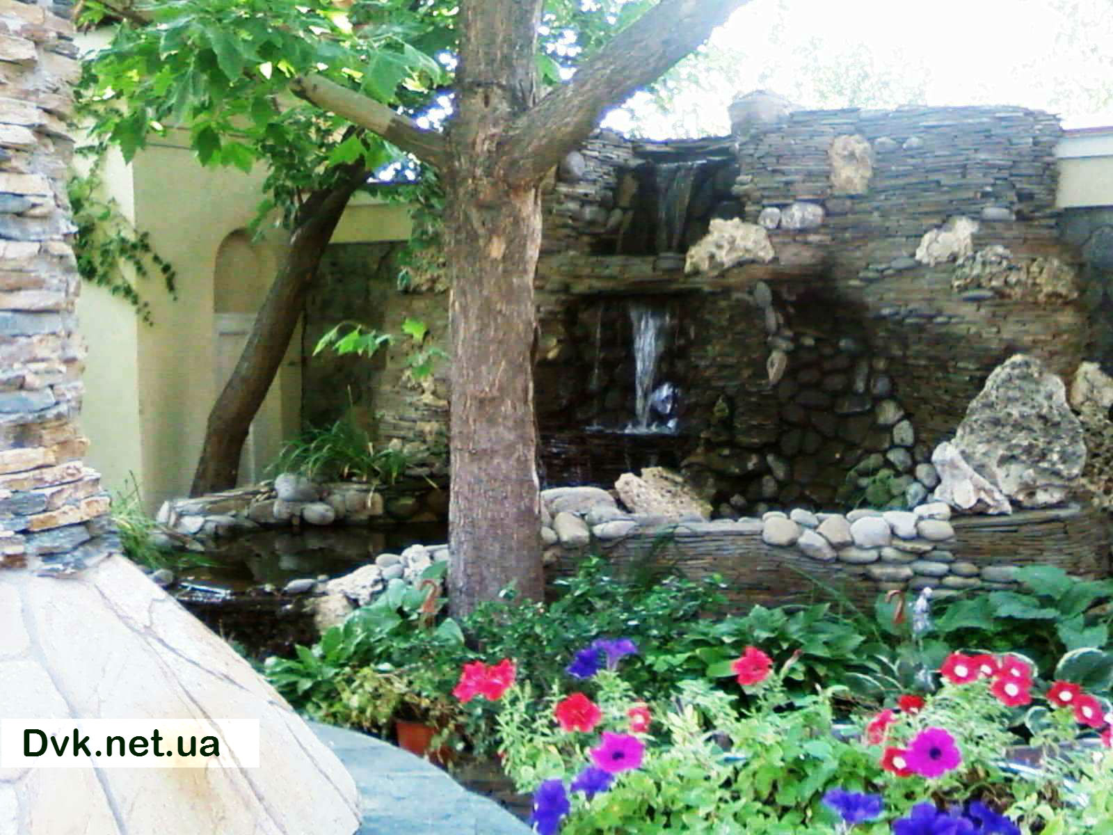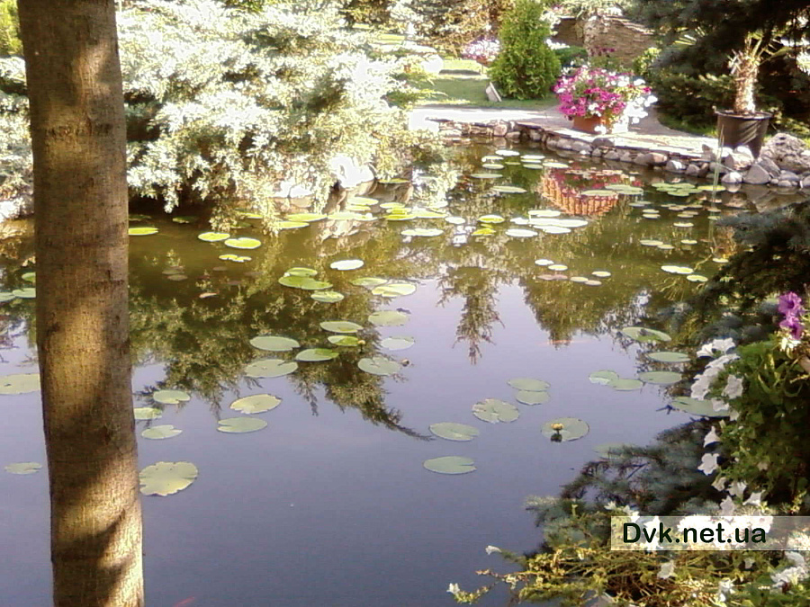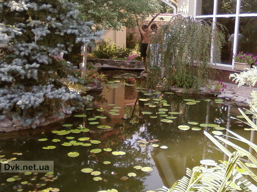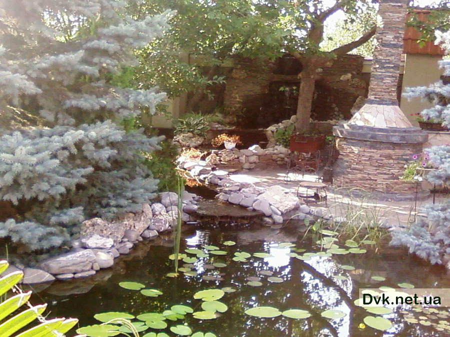 Створення затишного водного саду зі ставком, в якому мешкають коропи Коі. Звук руху води у водоспаді створює атмосферу спокою та розслаблює. Барна стійка з кам'яним оздобленням на відкритому повітрі, зелені стіни з високою ялини, водні лілії в ставку - все разом створює затишну зону для відпочинку та проведення сімейних вечорів.